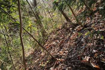ここから斜面を適当に登って尾根の上に乗りたいと思います(^^;)