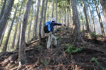 急坂なのでつい足元ばかりを見がちだが、まずは顔をあげて、これから進むルートを見極める。 そして次には足元に視点を移し、確実な足運びで斜面を攻め上げて行くのです。