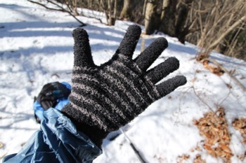 尾根の上は風も吹いているので、ウィンドブレイカーを素早く羽織り、安物の手袋を装備。