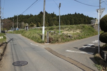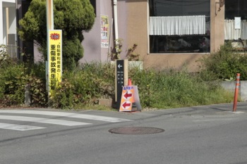 ちょいと進むと交差点が出て来ました。この周辺けっこう道が複雑なので、どう進むか迷ったのですが、良くみると交差点の向こうに道標が出ていました。