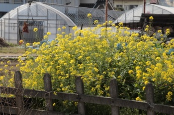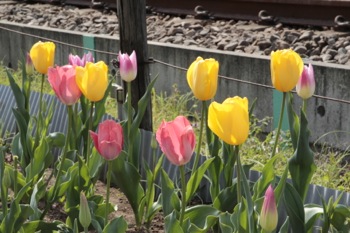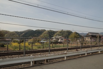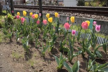 線路の脇には菜の花が咲いていたり、民家の庭先にも色とりどりの花が咲いていました。