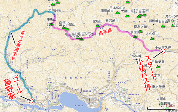 高尾駅 〜 小仏バス停 〜 景信山(727m) 〜 堂所山(731m) 〜 陣馬山(855m) 〜 藤野駅