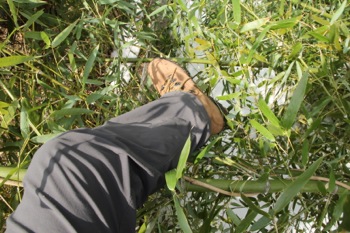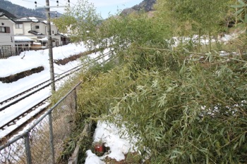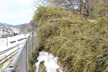 雪の重みで笹が倒れて道を塞いでました。