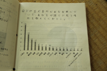 幾つかの班に分かれて、自分たちで決めたテーマに基いて、文献を呼んだり、地元の人にインタビューまでして作られている。 ありきたりの研究では無くて、例えば自分たちで新しい観光土産を作った場合にどのくらいのコストがかかって、どのくらいの収益が見込めるか・・などのシュミレーションなどもあり、大人が見ても驚くべき内容となっていた。学校の先生が指導してやっているんだろう。子供もすごいけど学校の指導もなかなか良いと感じました。伊豆大島の子供、なかなかレベルが高い。