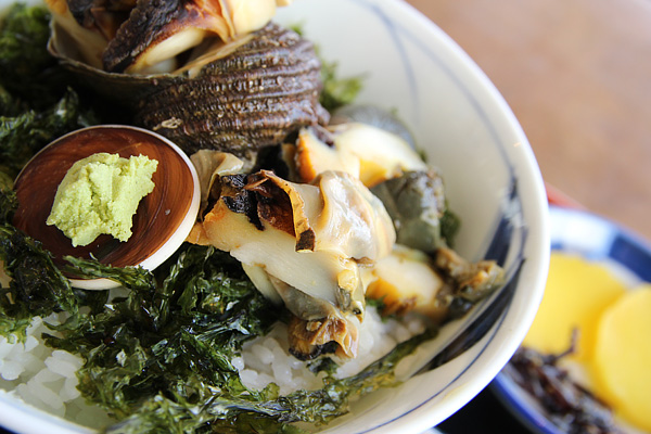 ほかほかご飯の上に、岩海苔が敷き詰められており、その上に、サザエが盛られています。