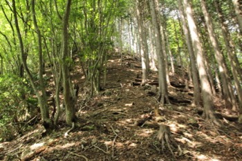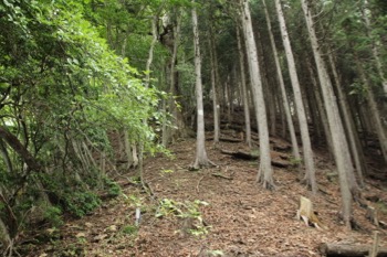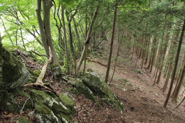 地図で見ると、向フ山からエビ小屋山の間は尾根の幅が狭く、左右が切れ落ちている様な道が多いのかと思っていたけど、そういう場所はほとんどない。