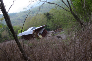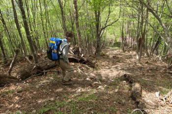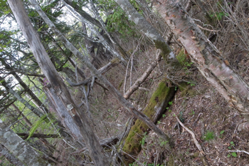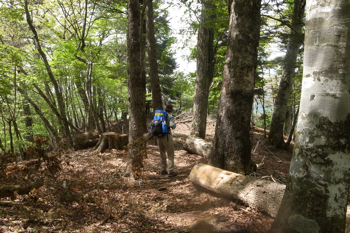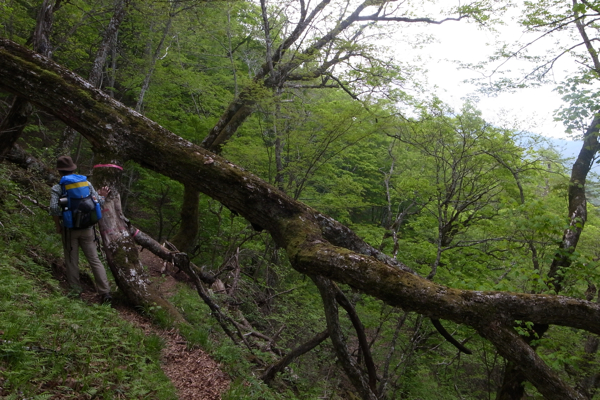倒木を避けて進む。