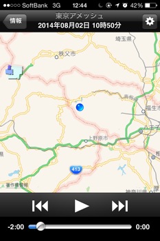 ふと見ると、ここでは携帯の電波が入っていたので、東京アメッシュ - NextBusinessSystem Co., Ltd.(iTunes store)で雨雲の発生具合をチェックしてみました。
